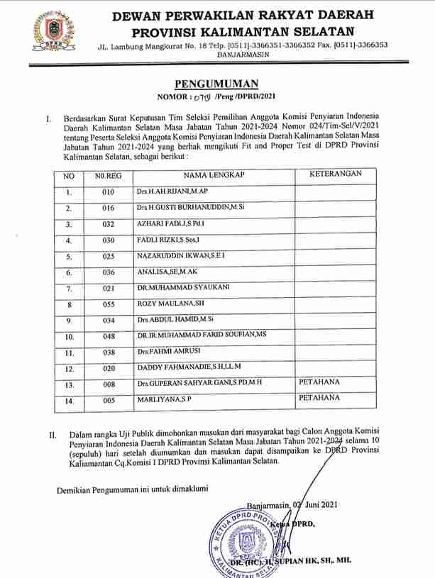 Komisi I DPRD Kalsel hingga kini menerima 14 nama kandidat calon Komisioner KPID Kalsel. Nama-nama yang lolos seleksi tersebut telah dilaporkan tim seleksi kepada DPRD Kalsel dan telah diumumkan melalui website DPRD Kalsel pada Kamis 3 Juni 2021. Semua calon komisioner tersebut sebelumnya telah lolos seleksi psikologi dan wawancara, namun selanjutnya mereka akan menjalani uji kelayakan dan kepatutan hingga dipilih tujuh orang.