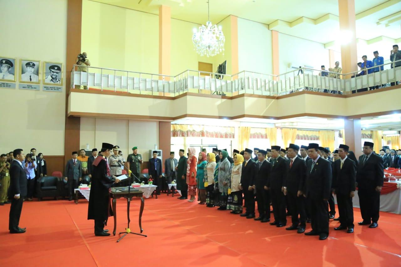 Amuntai, BARITO – 30 anggota Dewan Perwakilan Rakyat Daerah (DPRD) Kabupaten Hulu Sungai Utara (HSU) masa jabatan 2019-2024, Senin (5/8) resmi dilantik dan mengucapkan sumpah jabatan dihadapan Ketua Pengadilan Negeri (PN) Amuntai Budi Winata, SH MH.