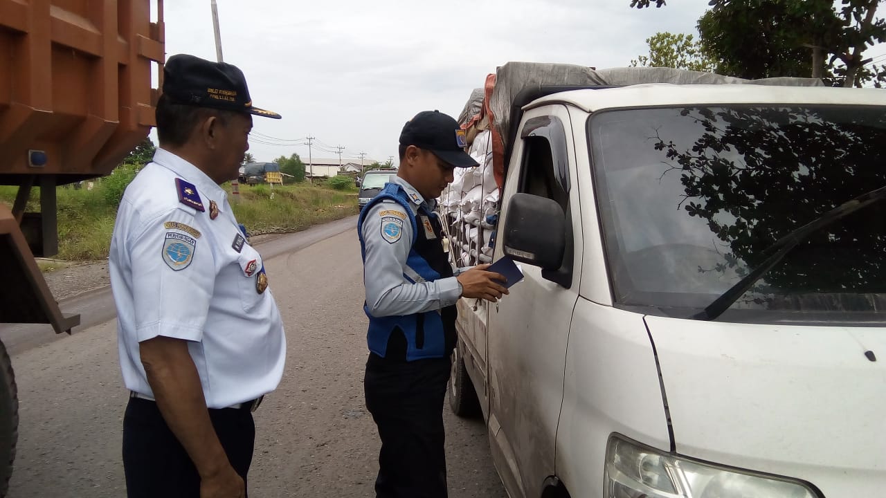 PERIKSA SURAT- Kasi Pengawasan dan Lalu Lintas (Wasdal) Dishub Kota Banjarmasin, M Yunus saat mendampingi petugasnya memeriksa surat menyurat terutama Uji KIR sopir mobil Pikap, Kamis (7/2) pagi. (foto:sum/brt)