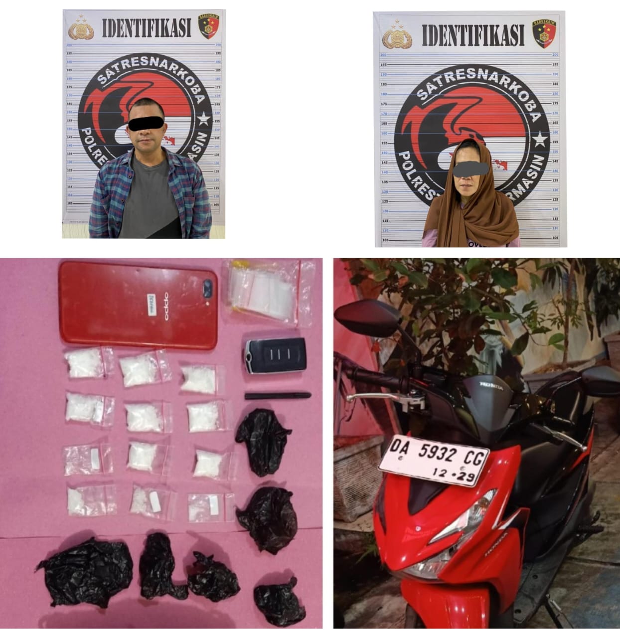 Pelaku perempuan berinisial AF (39) dan suaminya AR (48) diamankan dengan barang bukti awal berupa dua paket sabu-sabu seberat 4,82 gram. Setelah dilakukan penggeledahan di rumah mereka, polisi kembali menemukan 10 paket sabu-sabu dengan berat total 16,38 gram.