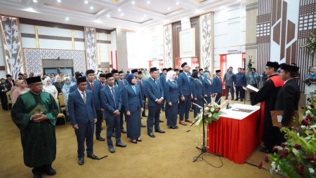 Para anggota DPRD yang dilantik nampak mengenakan Pakaian Sipil Lengkap (PSL) dan hadir bersama keluarga mereka, menambah khidmat suasana pelantikan.