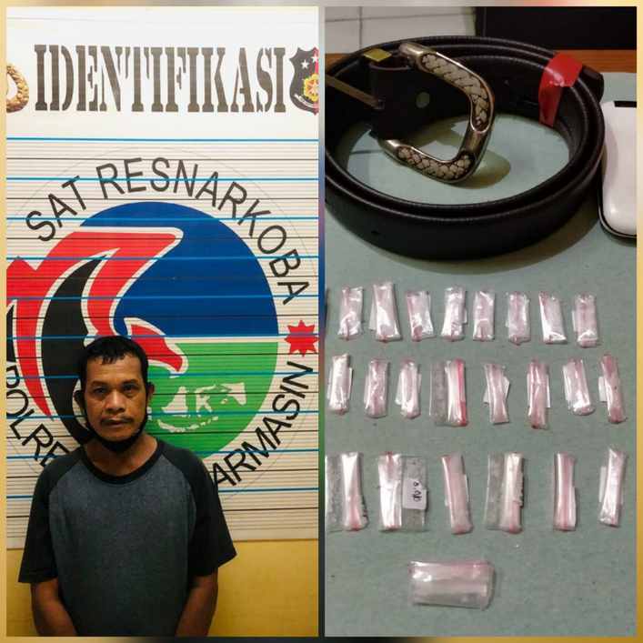 Pelaku warga Jalan Yos Sudarso Gang Sidomulyo 2 RT 22 RW 02 No 13 Kelurahan Telaga Biru Kecamatan Banjarmasin Barat digiring ke Sat Narkoba Polresta Banjarmasin, guna mempertanggung jawabkan perbuatannya. Selain Shabu juga disita  satu ikat pinggang dan  satu ponsel merk Samsung warna Putih.