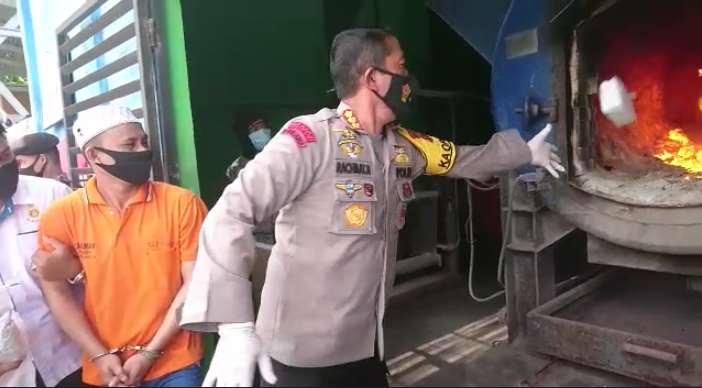 “Kami juga hadirkan para tersangka agar mereka tahu dan melihat langsung kalau barang haram yang mengantarkan mereka ke balik jeruji besi itu sudah kami musnahkan,” ucapnya Kapolresta didampingi Kasat Reserse Narkoba Kompol Wahyu Hidayat.