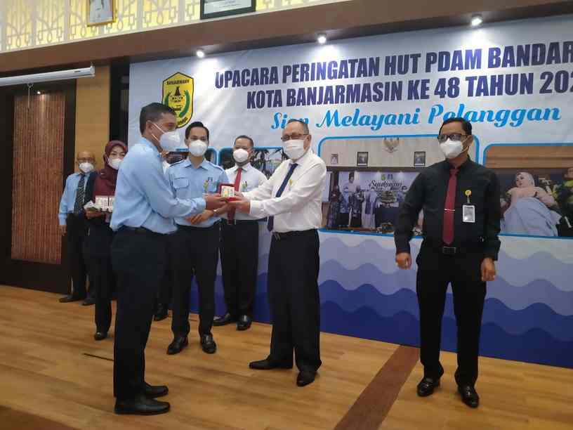 Banjarmasin, BARITO – 46 karyawan PDAM Bandarmasih menerima penghargaan logam mulia (emas 99) bernilai jutaan rupiah dalam momentum hari jadi ke 48 PDAM Bandarmasih, Rabu (17/2).