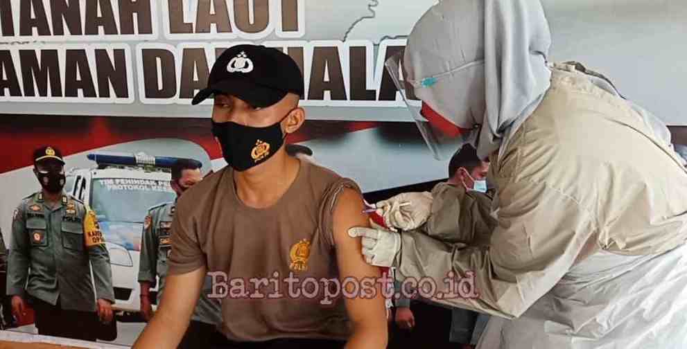 Proses vaksin sinovac dilakukan tim medis dari Dinas Kesehatan Kabupaten Tanah Laut serta disaksikan langsung Kapolres Tala AKBP Cuncun Kurniadi beserta para Pejabat Utama Polres Tala lainnya.