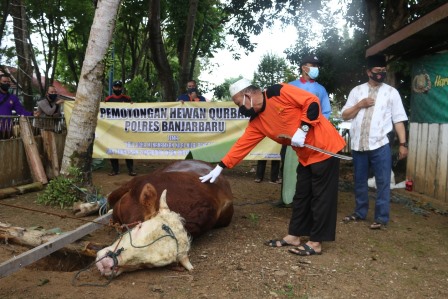 Untuk jumlah hewan yang di Qurbankan di Polres Banjarbaru yaitu sebanyak 5 (lima) ekor sapi, 2 (dua) ekor kambing. Sebelum dibagikan daging hewan kurban dilakukan pengecekkan oleh Dinas Peternakan Kota Banjarbaru untuk dilihat kesehatan dagingnya setelah dinyatakan aman dan sehat selanjutnya sebanyak 750 kantong daging hewan qurban dibagikan kepada masyarakat yang membutuhkan ditengah pandemi Covid-19.