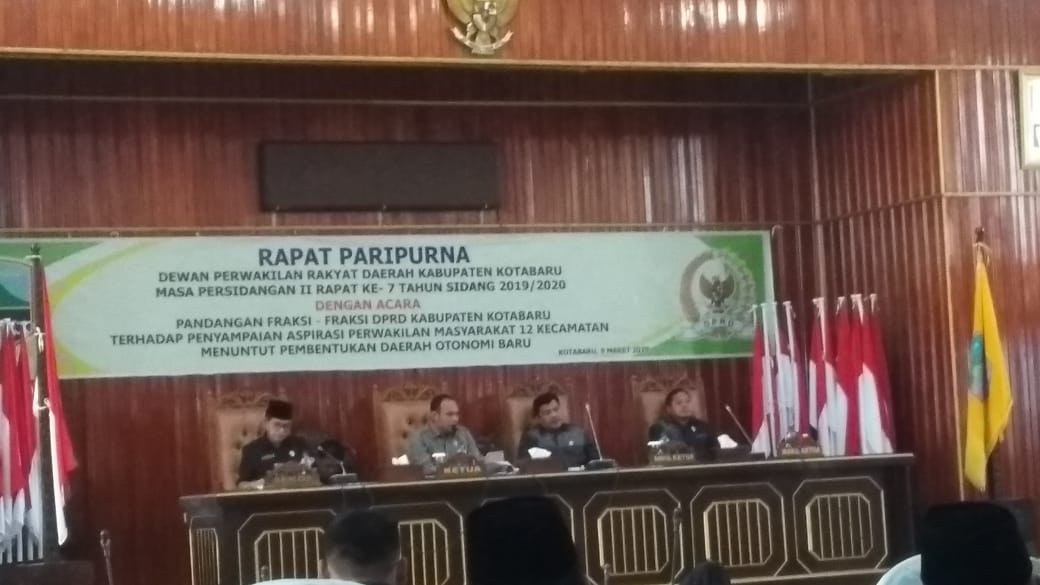 Menurut Ketua DPRD Kotabaru Syairi Mukhlis, S Sos mengatakan, Rapar Paripurna DPRD ini acara Pemandangan Fraksi-Fraksi DPRD Kabupaten Kotabaru terhadap Penyampaian Aspirasi Perwakilan Masyarakat 12 Kecamatan menutut Pembentukan Daerah Otonomi Baru (DOB)