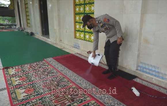 Pelaihari,BARITO – Aksi Brigadir Deddy Purnomo anggota Binmas Polres Tala Jum’at, (7/5/2021) pagi disertai dengan sebuah peralatan yang ia jinjing berwarna putih, terlihat menuju masjid Al Hijriah Angsau. Kedatangan saat itu adalah untuk memberikan pelayanan secara gratis berupa Foging Disenfektan.