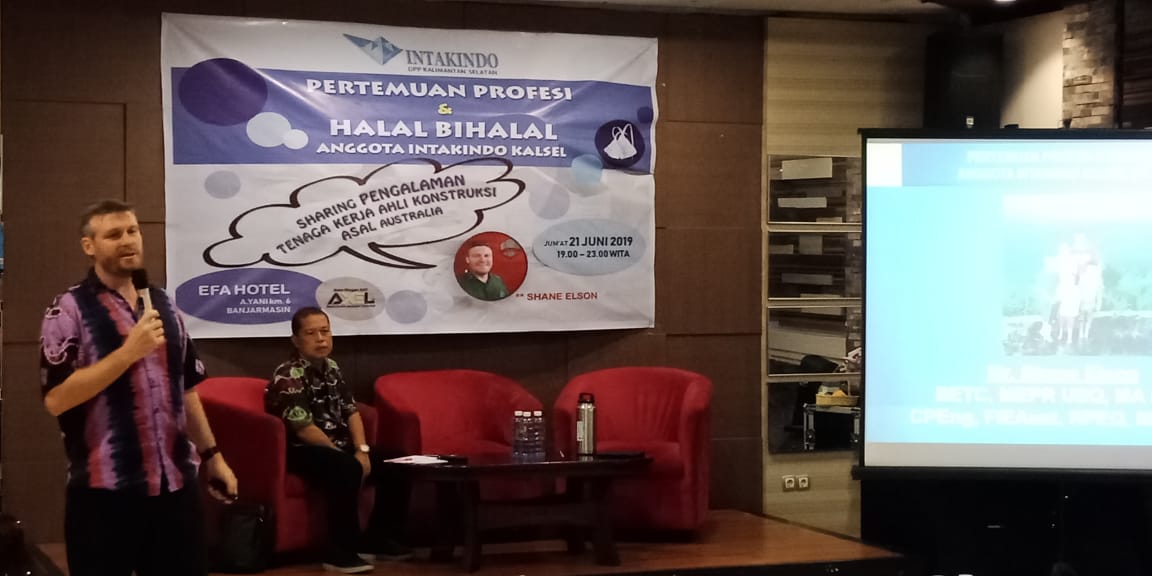 Ia menilai Indonesia dan Australia sangat berbeda dalam bekerja di sektor konstruksi. “Kebijakan sektor konstruksi di Indonesia lebih mudah ketimbang di Australia. Ya malam ini saya mau berbagi tentang pengalaman saya di Australia dulu saya bekerja selama 15 tahun sebagai insinyur,” ujar Mr Shane Elson dalam paparan pengalaman kepada anggota Intakindo Kalsel.