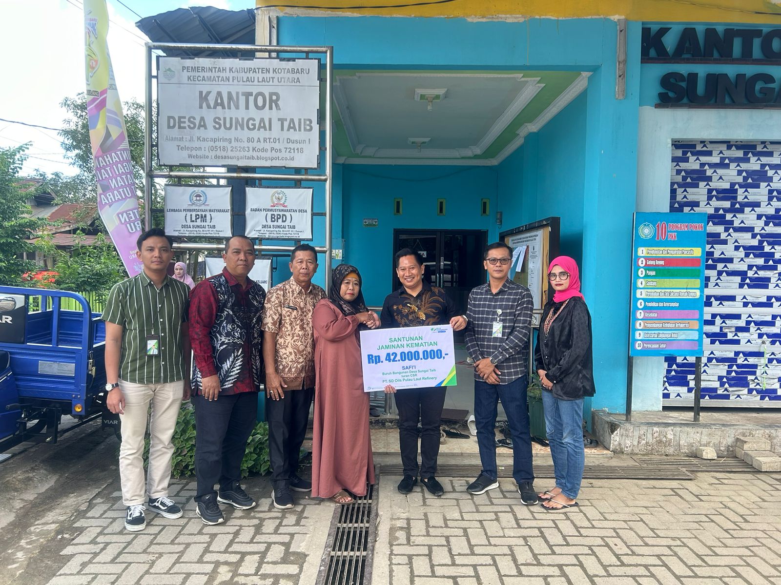 Penyerahan santunan ini juga dihadiri tim dari Manager HRD Koesdaryanto didampingi Kepala Desa Sungai Taib, H Sunarto.