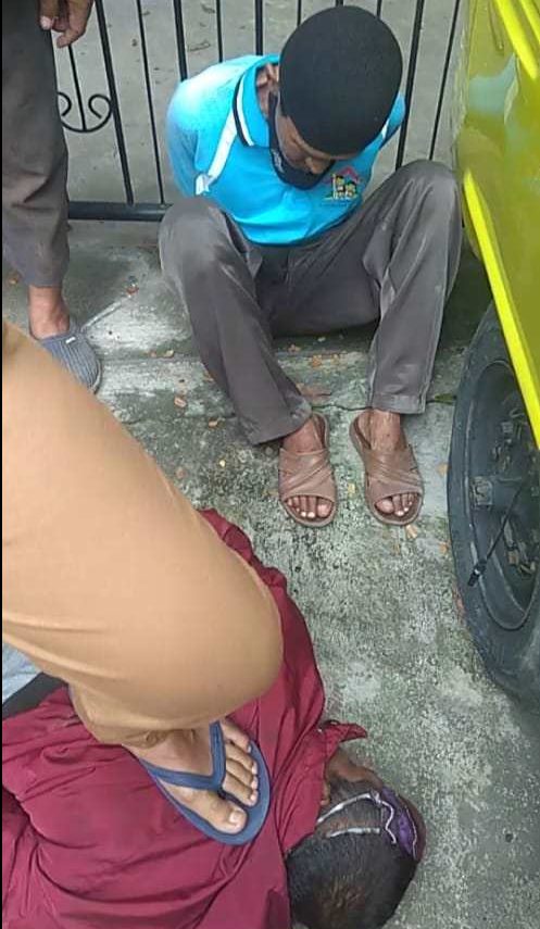 Keduanya diikat warga dengan tangan di belakang, yang baju kaos biru duduk di pojok dekat mobil warna kuning metalic. Satu lagi dengan posisi telengkup ke tanah, lantaran diinjak seorang warga punggungnya.