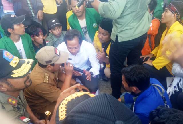 Gubernur Kalsel Sahbirin Noor didampingi beberapa pejabat terlihat menemui para mahasiswa. Paman Birin berdiri di tengah massa mahasiswa yang duduk lesehan di halaman Kantor Pemprov Kalsel. Gubernur kemudian berdialog dengan perwakilan mahasiswa melalui pengeras suara.