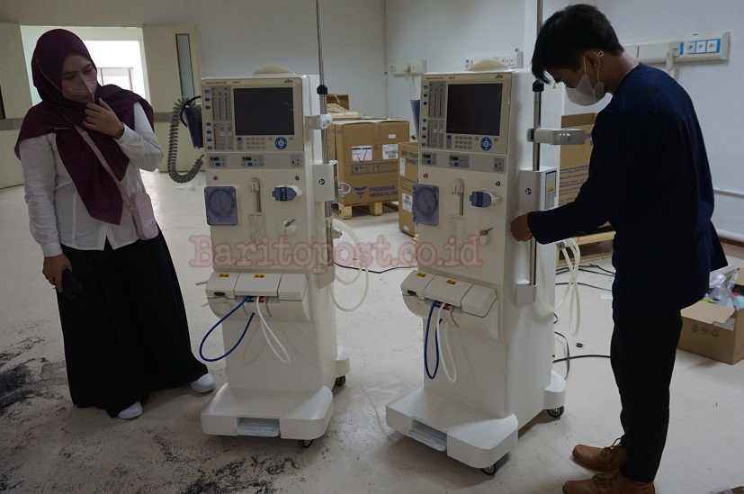 Rabu, (22/9/21) satu per satu disaksikan Kepala Bidang Penunjang pada RSHB Mahyuni Hidayat,SE, dan Kasi Penunjang Medis dan Non Medis Hj. Novita Sari, S. Farm,Apt, peralatan yang masih dalam bungkusan kardus berukuran besar dan terikat itu dibuka perlahan oleh teknisi yang special untuk melakukan pemasangan ornamen atau pelengkap peralatan pada alat cuci darah tersebut.