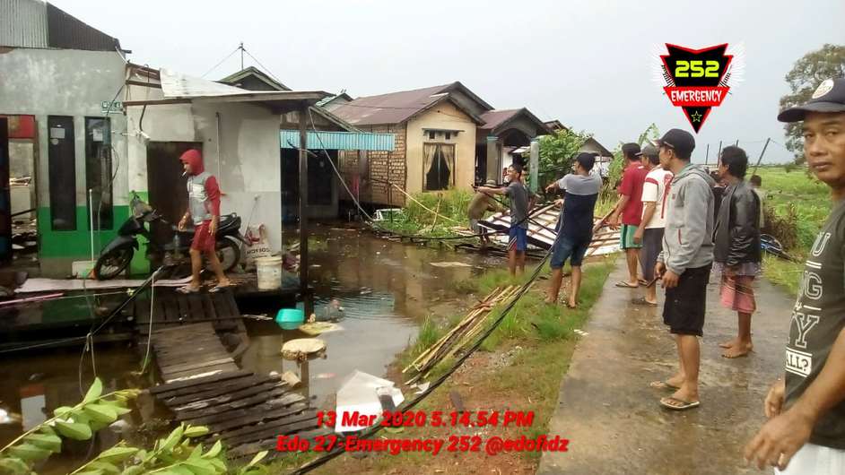 Informasi sementara aliran listrik masih aktif. Demikian disebutkan Upin 49 e’252 saat berada di lokasi kejadian. Kemudian musibah di Desa Tatah Badandan ada tiga rumah yang kena angin Puting Beliung, kondisi rumahnya bagian atas habis total