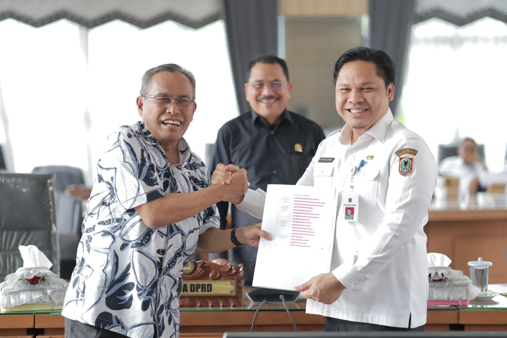 Sekdaprov Kalsel Roy Rizali Amwar saat menerima laporan pembahasan dari Komisi I DPRD Provinsi Kalsel yang diserahkan oleh H Suripno Sumas disaksikan Ketua DPRD Provinsi Kalsel H Supian HK.(foto : humasdprdkalsel)