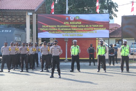 Polres Batola dalam rangka penegakan peraturan Bupati Batola  nomor 54 terkait pelaksanaan pembatasan kegiatan masyarakat untuk percepatan penanganan corona virus disease 2019 Covid – 19 Pemerintah Kabupaten Batola menggelar apel kesiapan dalam rangka pelaksanaan peraturan Bupati Batola Nomor 54 Tahun 2020 tentang  pedoman pelaksanaan pembatasan kegiatan masyarakat dalam rangka percepatan penanganan Covid-19 di Kab Batola.