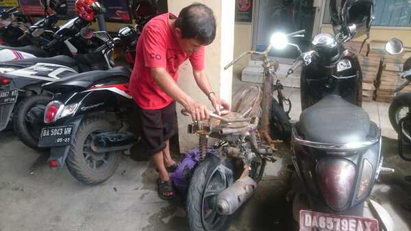 Banjarmasin, BARITOPOST.CO.ID – Sungguh apes nasib pemuda berinisial FP, sudah jadi korban pengeroyokan motor miliknya Yamaha Mio dibakar. Satu unit ranmor tinggal rangka terparkir di depan Sat Reskrim Polresta Banjarmasin, Rabu (26/10/2022) pagi.