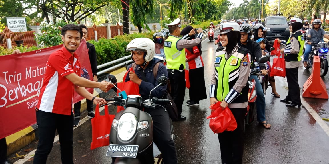 Banjarmasin, BARITO – Membagikan takjil kepada pengendara roda dua yang melintas di lampu merah Jalan Jenderal Sudirman Masjid Raya Sabilal Muhtadin digelar serentak Trio Motor bersama satlantas Polresta Banjarmasin, dan 59 jaringan dealer di Kalselteng pada Sabtu (25/5) .