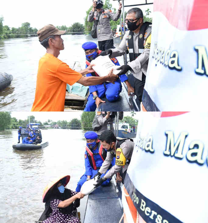 Paket sembako dibagikan kepada warga miskin dan terdampak Covid-19  melalui speed boat milik Ditpolair Polda Kalsel  serta langsung mengunjungi warga ” Pembagian dilakukan door to door sesuai protokol kesehatan dan tidak mengumpulkan massa” terang  Kabid Humas Polda Kalsel Kombes Pol Mochammad Rifai melalui rilisnya .