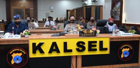 Dalam rangka menangani Pandemi Covid-19, Kapolda Kalsel Irjen Pol. Dr. Nico Afinta, S.I.K., S.H., M.H., bersama Ketua Bawaslu Kalsel Erna Kasypsiah, S.Ag., M.Si., Komisioner KPU Kalsel Siswandi Reya’an, Wakapolda Kalsel, Irwasda Polda Kalsel dan Pejabat Utama Polda Kalsel melakukan video conference (Vicon) yang diipimpin langsung Wakapolri Komjen Pol. Dr. Drs. Gatot Eddy Pramono, M.Si., Senin (7/9/2020) pukul 08.30 Wita.