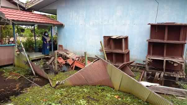 “Kerusakan tempat parkir sepeda diduga karena intensitas angin bertiup kencang disertai hujan cukup deras,’sebutnya. Sedangkan aliran sungai meluap deras yang mengarah ke sungai di depan sekolahan. Akibatnya pondasi tempat parkir sepeda tergerus air sungai, yang menyebabkan bangunan tempat parkir ambruk.