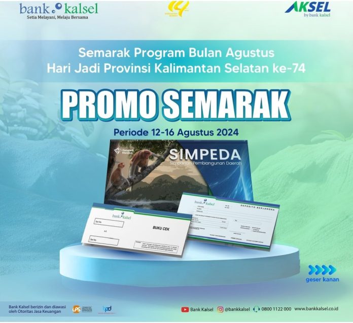 Banjarmasin, BARITOPOST.CO.ID – Bank Kalsel memberlakukan Promo Semarak diberlakukan mulai Senin, 12 Agustus hingga Jumat, 16 Agustus 2024.