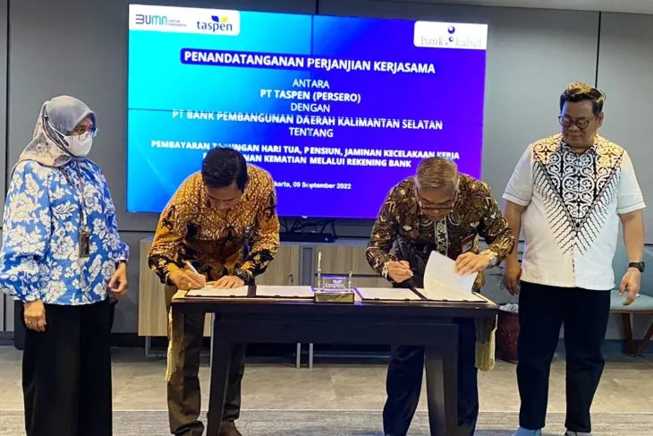 Banjarmasin, BARITO – Sebagai upaya meningkatkan kemudahan dan fasilitas bagi Aparatur Sipil Negara (ASN) di lingkup Kalimantan Selatan, Bank Kalsel melakukan penandatanganan kerjasama dengan PT Taspen (Persero) untuk secara resmi menjadi mitra pembayaran manfaat Peserta Taspen yang meliputi pembayaran Jaminan Hari Tua, Pensiunan, Jaminan Kecelakaan Kerja dan Jaminan Kematian.