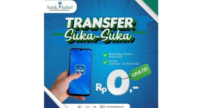 Sementara RTGS, yaitu transaksi bernilai Rp100 juta ke atas dan bersifat segera. Nah, dalam rangka menyambut HUT ke-58 Bank Kalsel, dua layanan transfer tersebut di Bank Kalsel Online bebas biaya administrasi. Dan promo ini berlaku sejak 25 Januari hingga 31 Maret 2022.