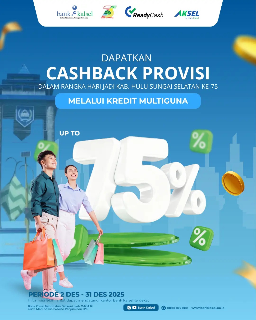 Kandangan, BARITOPOST.CO.ID – Dalam rangka memeriahkan Hari Jadi Kabupaten Hulu Sungai Selatan (HSS) ke-75, Bank Kalsel menghadirkan program spesial berupa Cashback Kredit Multiguna hingga 75%, sebagai bentuk apresiasi kepada masyarakat HSS sekaligus dukungan terhadap peningkatan kesejahteraan ekonomi daerah. Program promo ini berlangsung selama 2–31 Desember 2025 dan dapat dinikmati oleh masyarakat yang mengajukan Kredit Multiguna selama periode tersebut.