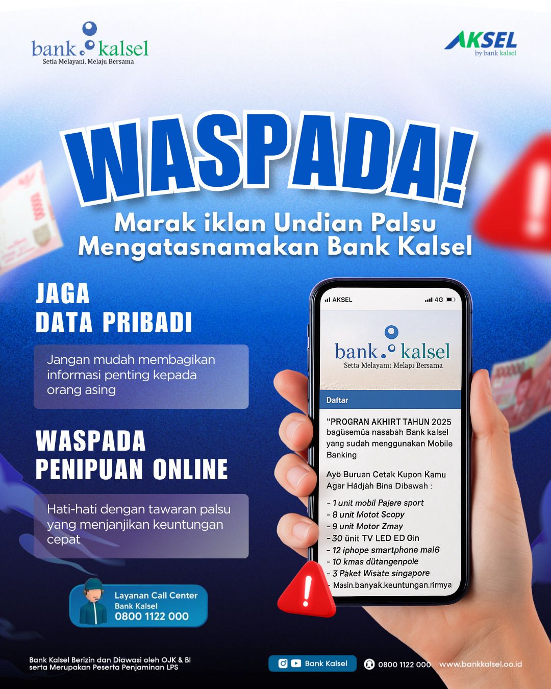 Banjarmasin, BARITOPOST.CO.ID — Bank Kalsel mengimbau seluruh masyarakat dan nasabah untuk meningkatkan kewaspadaan terhadap maraknya aksi penipuan yang menggunakan modus undian berhadiah akhir tahun, seperti hadiah mobil, motor, barang elektronik, paket umrah, hingga hadiah uang tunai, yang mengatasnamakan Bank Kalsel.
