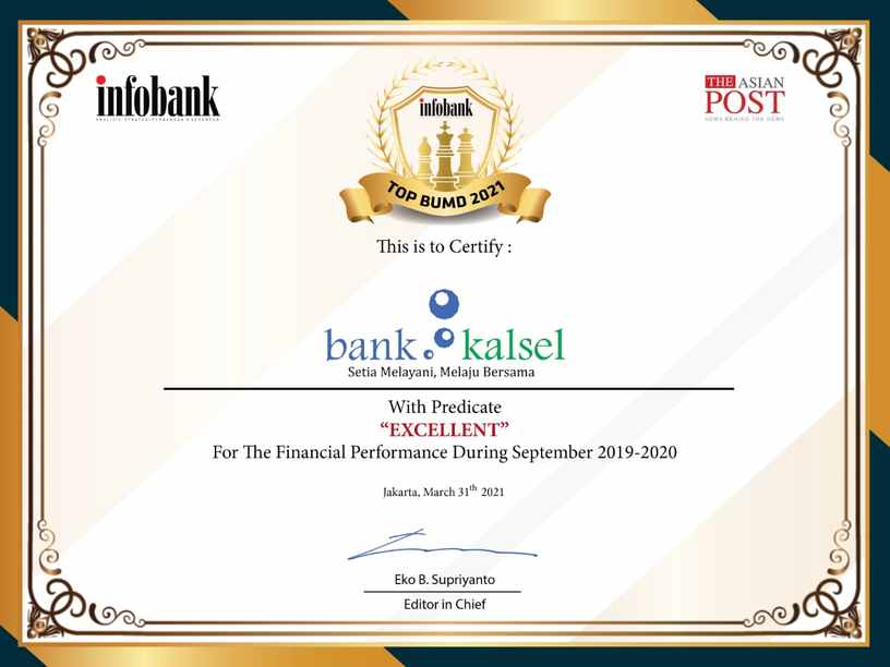 Pencapaian ini merupakan wujud dari komitmen dan dedikasi Bank Kalsel untuk memberikan yang terbaik bagi seluruh stakeholder dan shareholder. Tentunya, penghargaan ini tak lepas dari dukungan seluruh Pemegang Saham, nasabah dan masyarakat Kalimantan Selatan. Sebagaimana tagline “Setia Melayani, Melaju Bersama”, Bank Kalsel senantiasa memberikan yang terbaik serta menjadi mitra bagi masyarakat untuk maju dan berkembang bersama.
