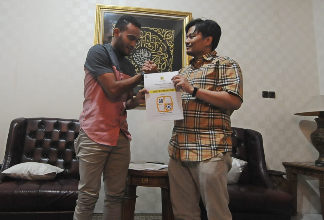 Banjarmasin, BARITO – Winger Barito Putera, Rizki Rizaldi Pora, menandatangani pembaharuan kontrak bersama manajer klub, Hasnuryadi Sulaiman, Senin (28/1) malan di Jalan Kampung Melayu Darat Banjarmasin. Pemain Timnas itu, masih terikat kontrak selama tiga tahun terhitung sejak 2018 lalu.