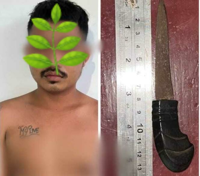 Kemudian pada saat di TKP didapati ketika diamankan dilakukan penggeledahan di badan. Selanjutnya ditemukan sebilah sajam jenis pisau dengan gagang yang terbuat dari kayu warna hitam tanpa sarung.