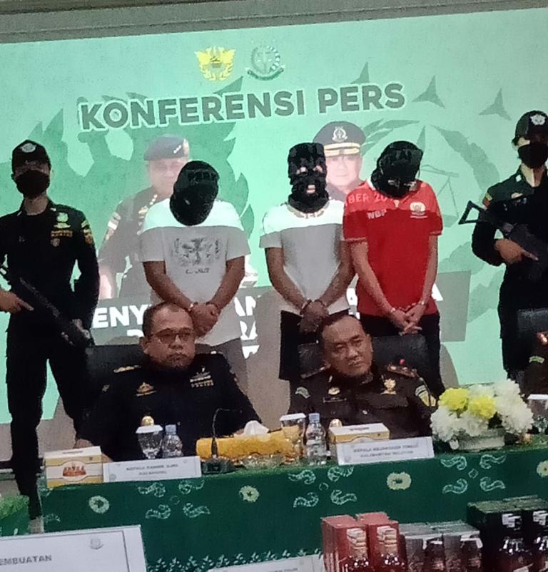 Selain ketiga tersangka, ratusan botol miras dengan berbagai merk serta barang bukti lainnya berupa drum, botol kosong alat penyaring, pita cukai palsu, seta bahan baku berupa air mineral, etil alkohol, propylene glycol, esens dan campuran lainnya juga ikut diserahkan.