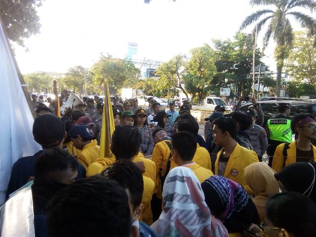 Badan Eksekutif Mahasiswa (BEM) se Kalsel menggelar aksi demo ke Konisi Pemilihan Umun (KPU) Kalsel di Jalan A Yani Km 3,5 Banjarmasin , Kamis (9/5/2019) sore. Namun aksi mahasiswa sekitar 50 orang itu dihalangi pihak kepolisian.