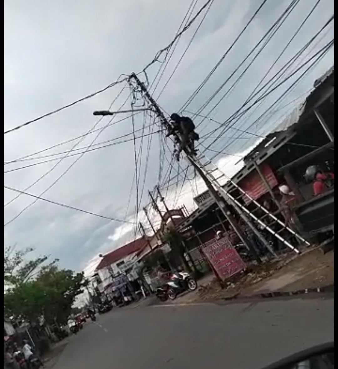 Lalu dia naik ke tiang menggunakan tangga dan temannya ada di bawah. Namun, pria tersebut naik ke tiang tidak menggunakan pakaian pengaman diri.