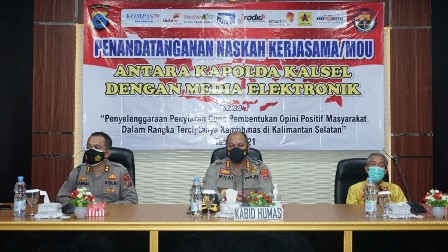 Penandatangan tersebut dipimpin Kapolda Kalsel Irjen Pol Drs. Rikwanto, S.H., M.Hum. diwakili Kabid Humas Polda Kalsel Kombes Pol Mochamad Rifa’i, S.I.K. dengan dihadiri Kasubbid Penmas Bid Humas Polda Kalsel, Kasubbid PID Bid Humas Polda Kalsel, Kasubbag Renmin Bid Humas Polda Kalsel, para Kasubbag Renmin Satker Polda Kalsel, Pimred Media Elektronik Provinsi Kalsel (Kompas Tv, Duta Tv, Banjar Tv, Radio RRI, Iradio, Smart FM, Abdi Persada, Radio Nirwana), Anggota Polri, PNS Polri dan PHL Bid Humas Polda Kalsel.
