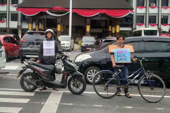 Seperti yang dilakukan Arbani dan Fahrianoor. Dua mahasiswa dari salah satu Kampus di Banjarmasin ini melakukan demo tolak kenaikan BBM hanya menggunakan sepeda dan motor.