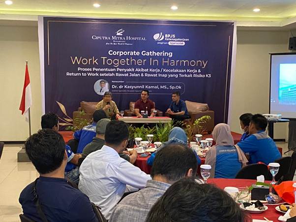 Acara tersebut dihadiri oleh Pimpinan Ciputra Mitra Hospital Manager Marketing Supriyono Rahardja bersama Manager Pelayanan Drg Sandra Maria, Kepala Bidang Pelayanan BPJS Ketenagakerjaan Ikhwan Nor Abyadh serta Dr dr Kasyunnil Kamal, MS, Sp.O Dokter Specialis Okupasi selaku narasumber di Hotel Ebony Soeraja Hall, Rabu (16/11/2022).