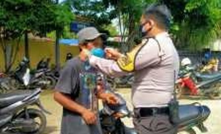 Seperti yang dilakukan Bhabinkamtibmas Bripka Heru membagikan sejumlah masker kepada warga desa binaannya yang belum atau lupa menggunakan masker.