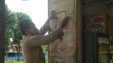 Bhabinkamtibmas Polsek Banjarbaru Timur Polda Kalsel Bripka Dwi Rohmad terus sosialisasikan dan laksanakan penempelan maklumat Kapolri, dilingkungan desa binaan Kelurahan Bangkal Kecamatan Cempaka Kota Banjarbaru, Selasa (29/9/2020). Penempelan Maklumat dilakukan di tempat tempat strategis agar mudah dilihat dan dibaca oleh warga. Poin penting dalam maklumat tersebut tentang kepatuhan terhadap protokol kesehatan dalam pelaksanaan pemilihan tahun 2020.