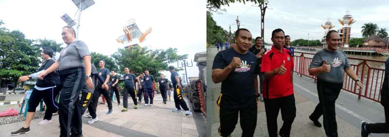 ‘Kita sudah pernah meriset bahwa dalam kebutuhan sehari hari orang harus melangkah minimal 10.000 langkah, dan berdasarkan penelitian di Jepang juga demikian, akhirnya kita mensurvei lokasi dikawasan sekitaran Polda yang layak untuk melakukan Gerakan 10.000 Langkah, dan akhirnya kita nyatakan tempat itu di Siring Menara Pandang’ ujar Kabid Dokkes Polda Kalsel Kombes Pol dr. Erwinn Zainul Hakim, MARS, M.H.Kes kepada wartawan usai aksi