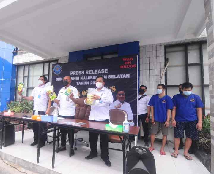 “Jadi ini jaringan pulau Kalimantan pasokan narkotika dari Kalbar untuk tujuan pemasaran Kalsel,” terang Kepala BNNP Kalsel Brigjen Pol Jackson Arison Lapalonga saat Press Conference depan Kamtor BNNP Kalsel, Kamis (4/11/2021)