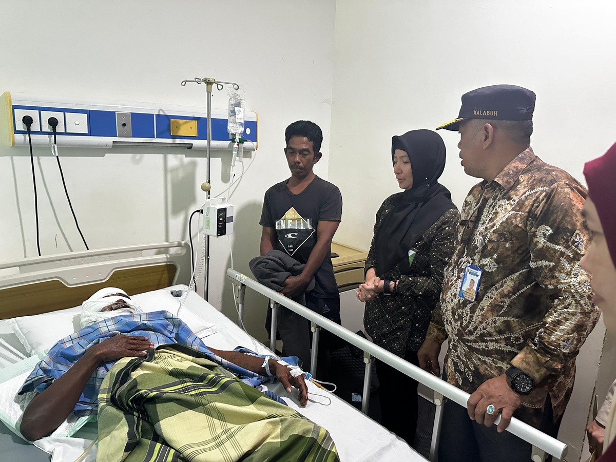 Kepala BPJS Ketenagakerjaan Kantor Cabang Batulicin Vina Dwina Yuskin melakukan kunjungan bersama Kepala Pelabuhan Perikanan Batulicin Ahmad Syarwani dan Direktur Rumah Sakit Marina Permata Batulicin dokter Masliani saat mengunjungi korban laka kerja bernama Abdan di rumah sakit setempat, Rabu malam (5/11/2025).(foto :ist)