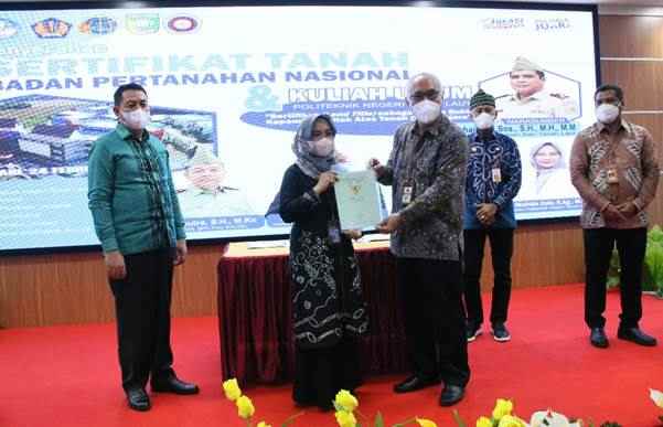 Pelaihari,BARITO – Sebuah kebanggan bagi manajemen Politeknik Negeri Tanah Laut (Politala) Kalsel yang mendapatkan sertifikat tanah dari Badan Pertanahan Nasional (BPN) Kabupaten Tanah Laut. Penyerahan sertifikat tanah Kamis, (24/2/22) di aula Gedung Kuliah Terpadu Syekh Muhammad Arsyad al-Banjari kampus Politala.