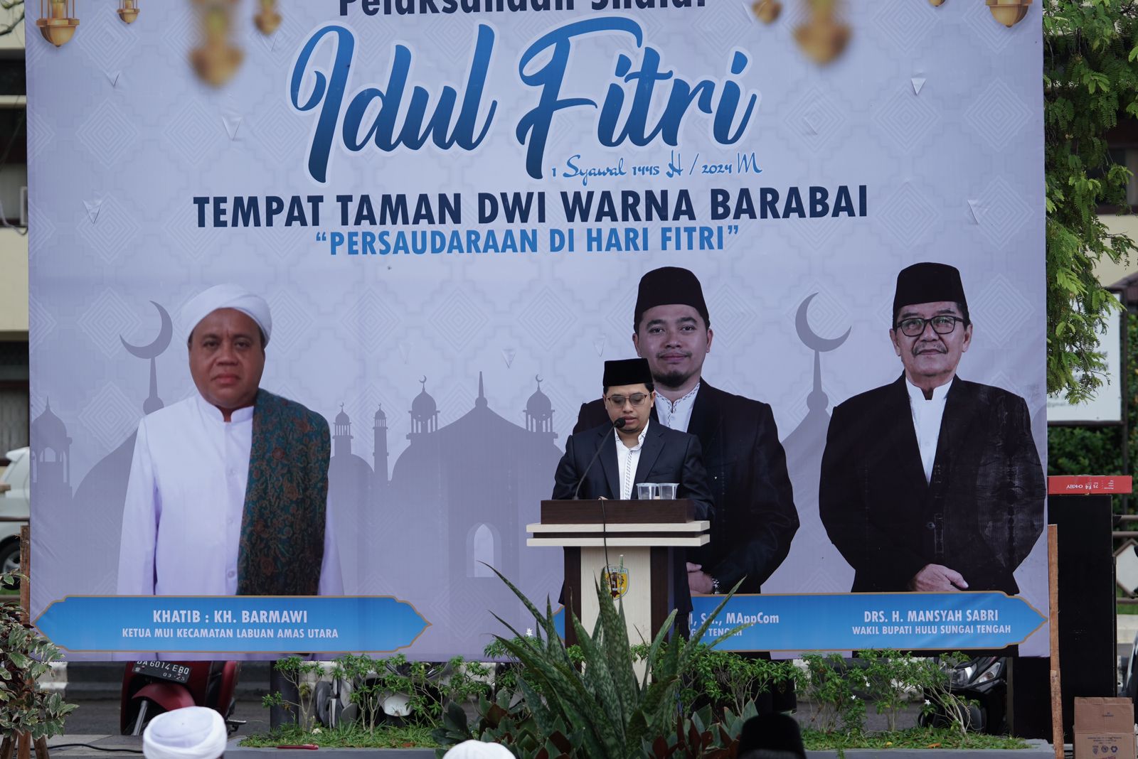Dalam kegiatan shalat Idul Fitri yang dilaksanakan Pemkab HST di Taman Dwi Warna ini bertindak sebagai Khatib KH Barmawi yang merupakan Ketua MUI Kecamatan Labuan Amas utara, dan Imam Ustadz H Muhammad Harawi.