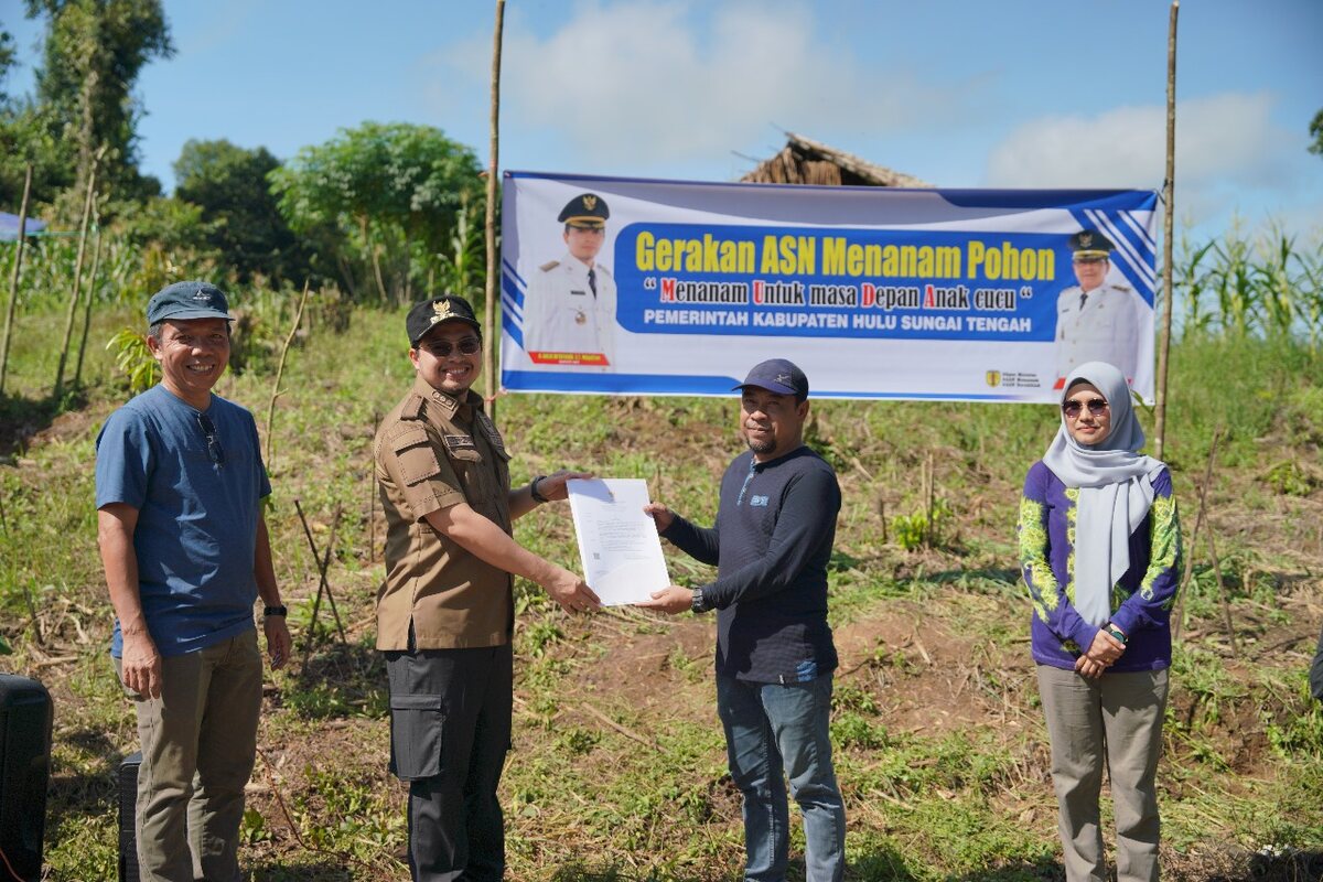 Bupati HST H Aulia Oktafiandi memimpin penanaman bibit pohon durian bersama 191 ASN lingkup pemkab HST yang bertempat di Desa Wawai Gardu Kecamatan Batang Alai Timur (BAT), Kamis (2/5/2024).