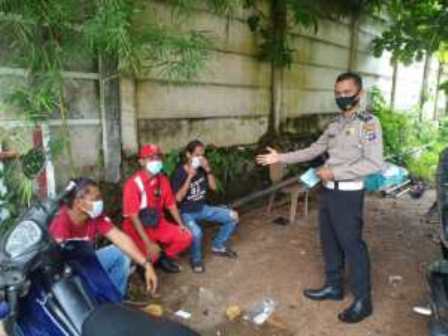 Personil Unit Lantas Polsek Banjarbaru Barat jajaran Polres Banjarbaru, Polda Kalsel, usai melaksanakan patroli rutin sore hari Bripka Sukma sambangi warga yang tidak menggnakan masker untuk menjalin tali silahturahmi dan memberikan imbauan, edukasi dan memastikan protokol kesehatan kepada warga masyarakat untuk pencegahan Covid 19 di wilayah Kelurahan Landasan Ulin Barat Kota Banjarbaru.