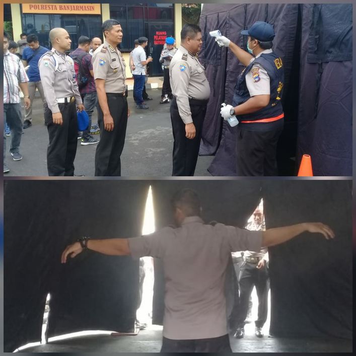 Banjarmasin, BARITO – Mencegah penyebaran Corona Virus Desease (Covid) 19 yang mewabah, Polresta Banjarmasin memberlakukan sistem One System Gate Sterilisasi, Selasa (24/3/2020). Setiap tamu yang datang ke Polresta diwajibkan lewat depan dan masuk ke Tenda Posko Sterilisasi untuk penyemprotan.