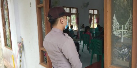 Kegiatan agama mingguan yang di laksanakan di rumah ibadah (Gereja Maranatha) di Desa Sepakat Kecamatan Mantewe Kabupaten Tanah Bumbu dijaga oleh beberapa anggota Polsek Mantewe, Minggu (06/09/2020)